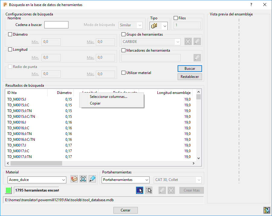 Es posible copiar trayectorias y datos de herramientas de los cuadros de diálogo de Programa CN y Búsqueda en la base de datos de herramientas al portapapeles de Windows. Es útil si desea crear informes utilizando otras aplicaciones.