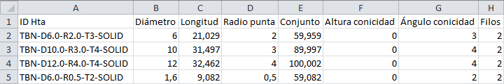 Por ejemplo, los datos copiados de la base de datos de herramientas a una hoja de cálculo se parecen a: