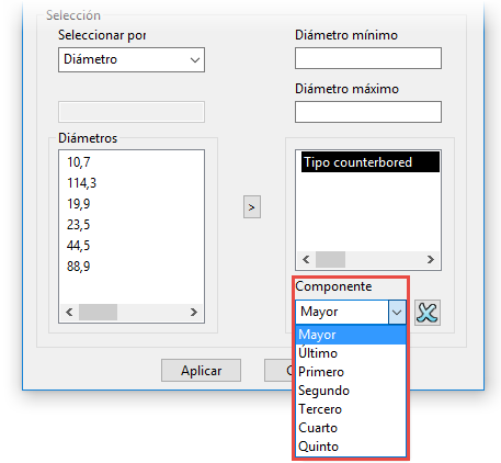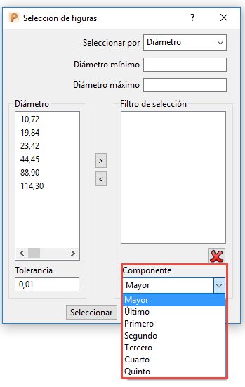 Utilice Componente para seleccionar un agujero por el diámetro o la longitud de un componente de agujero específico. Se selecciona el agujero completo (no solo el componente de agujero).