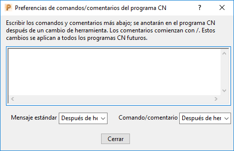 Comando/comentario — Seleccione el valor por defecto para comando/comentarios. Esto especifica la ubicación de salida de los comandos/comentarios agregados aquí. Hay dos opciones: antes de un cambio de herramienta; después de un cambio de herramienta. Si se introduce un comando aquí, es necesario asegurarse de que el fichero de opciones está configurado para recibir el comando.