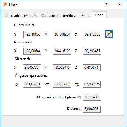 Diferencia — Muestra la diferencia en X, Y y Z entre el Punto inicial y el Punto final.