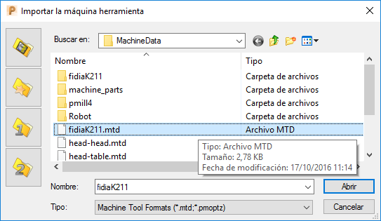 - En el directorio de MachineData [Datos de máquina] seleccione la máquina herramienta seleccionada, en este caso fidiak211.mtd. La máquina herramienta siempre tiene una extensión *.mtd.