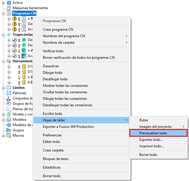 Se crean varios ficheros HTML temporales en la carpeta del proyecto y se abre la pestaña del PowerMill de PowerMill que recoge las hojas de taller.