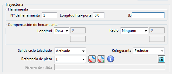 Nº de herramienta — Introduzca el número de herramienta que se utiliza en la trayectoria. Por defecto, es el mismo que el de Nº de herramienta en la pestaña de Punta del cuadro de diálogo de Herramienta. Se añade al fichero de corte (cutfile).