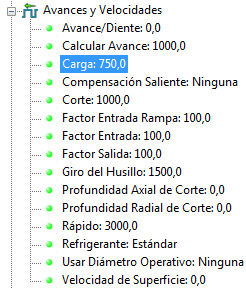 - En la zona de Condiciones de corte del cuadro de diálogo de Avances y velocidades, introduzca un Avance de carga de 750 mm/min. Haga clic en Aceptar.