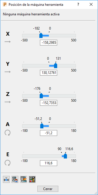 El cuadro de diálogo muestra la posición de cada eje de la máquina herramienta. Mostrar el cuadro de diálogo es útil porque permite ver el movimiento de los ejes y, en particular, si se mueve un eje más allá de su límite.