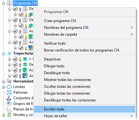- Desde el menú contextual de Programas CN, seleccione Escribir todo para escribir todos los programas CN.