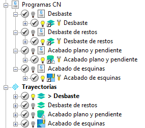 - PowerMill crea un programa CN para cada trayectoria, con el mismo nombre que la trayectoria. Expanda la lista del programa CN para ver los programas CN creados.