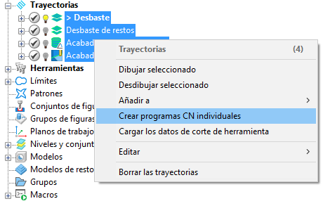 - Desde el menú contextual de Trayectorias seleccionado, seleccione Crear programas CN individuales para seleccionar las trayectorias que desea convertir en programas CN (en este ejemplo, todas).