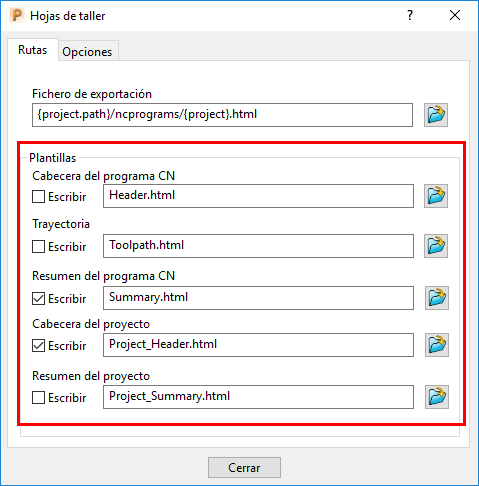 - Mantenga el conjunto de plantillas por defecto y utilice las casillas Escribir para especificar qué plantillas deben utilizarse para crear hojas de taller. Por ejemplo, si solo necesita una página de encabezado específica del proyecto y las hojas de resumen del programa CN, anule la selección de las casillas Escribir para Header.html, Toolpath.html y Project_Summary.html.