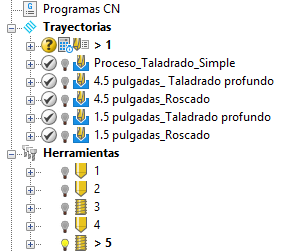 Amplíe las trayectorias para ver el método de taladrado creado, las trayectorias y las herramientas creadas