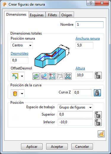 Posición ranura — Seleccione una opción de la lista para especificar la posición de la ranura en relación con la curva del perfil.