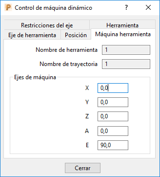 La pestaña de Máquina herramienta en el cuadro de diálogo de Control de máquina dinámico muestra la posición de cada eje de la máquina herramienta. Los valores se actualizan automáticamente cuando se utilizan los controladores interactivos para ajustar la posición de los ejes de la máquina herramienta.