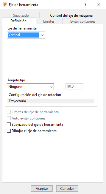 El cuadro de diálogo de Eje de herramienta contiene las pestañas siguientes:
