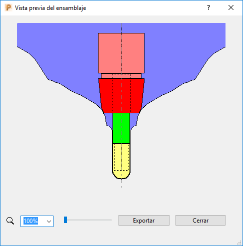 Exportar — Haga clic para guardar la vista actual del ensamblaje de herramienta como un fichero de gráficos. Si imprime la imagen del ensamblaje de herramienta con una escala de 1:1, la impresión se puede utilizar como guía cuando se rebaje el portaherramientas para evitar colisiones.