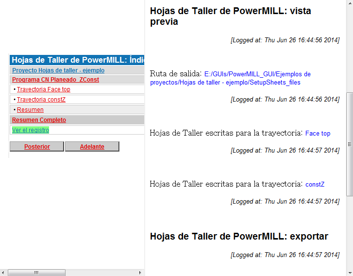 El registro de la hoja de taller se llama setupsheets_log.html. Se utiliza para clasificar los mensajes que se muestran en el cuadro de diálogo de Información durante las operaciones de la hoja de taller (como la vista previa y la exportación) junto con un sello de tiempo.