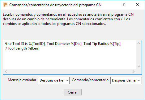 También se pueden utilizar variables en el cuadro de diálogo Preferencias de comandos/comentarios del programa CN, al que se accede haciendo clic en el botón Comentarios de la pestaña Trayectoria de Preferencias CN: