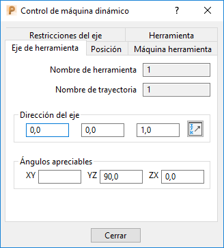 La pestaña de Eje de herramienta en el cuadro de diálogo de Control de máquina dinámico muestra la dirección del eje de herramienta como vectores y ángulos apreciables. Los valores se actualizan automáticamente cuando se utilizan los controladores interactivos para ajustar el eje de herramienta.