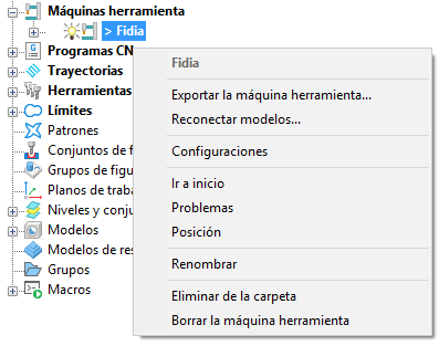 Para mostrar el menú, en el explorador, haga clic con el botón derecho en la máquina herramienta.