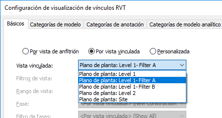 - Para Vista vinculada, seleccione la vista del modelo vinculado cuya configuración de visualización desea utilizar para el modelo vinculado en la vista de anfitrión actual.