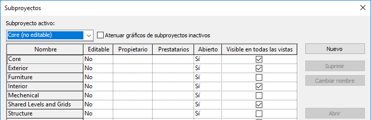 Al crear un subproyecto, utilice la opción Visible en todas las vistas del cuadro de diálogo Nuevo subproyecto para indicar si ese subproyecto se debe mostrar en todas las vistas del modelo. Este parámetro se refleja en la columna Visible en todas las vistas, en el cuadro de diálogo Subproyectos.