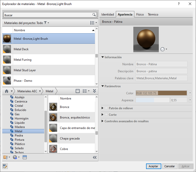 En la figura siguiente, se muestran algunas de las propiedades de aspecto del material seleccionado, tal y como aparecen en el Explorador de materiales.