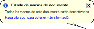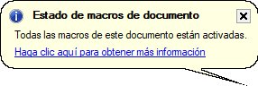 | Preguntar antes de activar macros de documento | Definido por el usuario. | Un cuadro de advertencia pide confirmación para activar o desactivar macros. El icono visible dependerá de la respuesta que dé el usuario. Es la opción por defecto. |