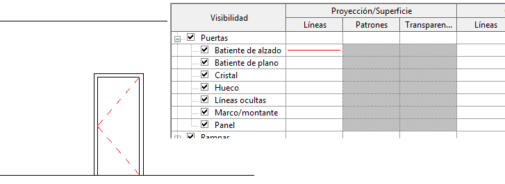 Puede utilizar subcategorías de un estilo de objeto para controlar la visibilidad y los gráficos de porciones de una familia dentro de una categoría. Por ejemplo, una subcategoría controla la visibilidad de un batiente de puerta en una vista de alzado. En la imagen siguiente, la subcategoría Batiente de alzado se modifica para utilizar una línea roja.