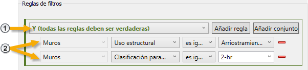 Por ejemplo, para crear un filtro que identifique puertas con una calificación para incendios de 2 horas, seleccione la categoría Puertas. Para crear un filtro que identifique puertas y muros con una calificación para incendios de 2 horas, seleccione las categorías Puertas y Muros.