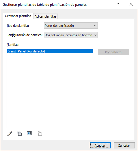 Puede utilizar el cuadro de diálogo Gestionar plantillas de tabla de planificación de paneles para editar, duplicar, suprimir y aplicar plantillas de tabla de planificación de paneles. También puede especificar la plantilla por defecto.