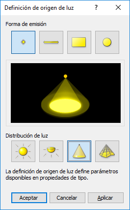 4. En Forma de emisión, seleccione la forma de la luz que se va a emitir desde el origen de luz: Punto, Línea, Rectángulo o Círculo.