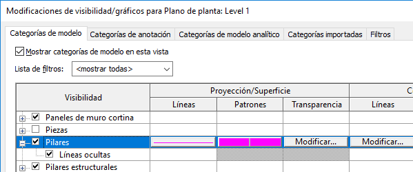 En la siguiente imagen, la categoría Pilares tiene modificaciones para líneas y patrones de superficie/proyección.