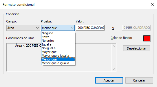 Nota: Asegúrese de seleccionar el campo cuyo formato desea cambiar en este cuadro de diálogo. Si selecciona un campo nuevo en el cuadro de diálogo Formato condicional, no estará especificando una nueva condición sino añadiendo una condición adicional al campo seleccionado en el paso 3.