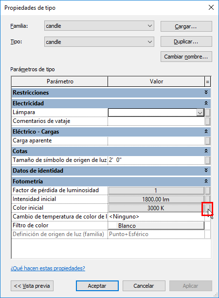 - En el cuadro de diálogo Parámetros y categoría de familia, en Parámetros de familia seleccione Origen de luz.