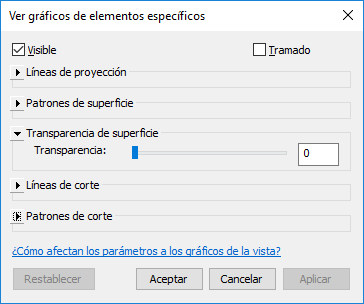 En el cuadro de diálogo Gráficos de elementos específicos de vista, se muestra la configuración actual de visualización de gráficos y visibilidad del elemento. Expanda cada sección para ver sus parámetros.