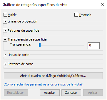 En el cuadro de diálogo Gráficos de categorías específicos de vista, se muestra la configuración actual de visualización de gráficos y visibilidad de la categoría seleccionada. Expanda cada sección para ver sus parámetros.