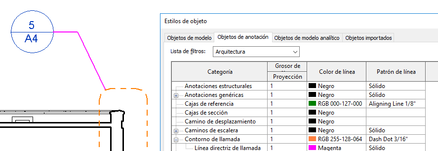 Puede controlar el color, patrón y grosor de línea que se utilizan para burbujas de llamada y líneas directrices. La configuración que especifique aquí se aplicará a todas las llamadas del proyecto.