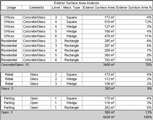Utilice el siguiente procedimiento para crear una tabla de planificación con la que analizar las áreas de superficie exterior de masas de un diseño conceptual. Los pasos requeridos en cada caso dependen de la información que se quiera mostrar en la tabla de planificación.
