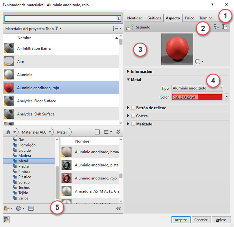 | 4 | Panel Propiedades: permite consultar y gestionar las propiedades detalladas para el objeto seleccionado. El nombre del activo y su descripción aparecen debajo del grupo desplegable Información. En el anterior ejemplo, se muestran expandidas las propiedades de Metal para el objeto Apariencia Anodizado - Rojo". Por ejemplo, el conjunto de propiedades que se muestra para un líquido es diferente al que se muestra para un metal. |