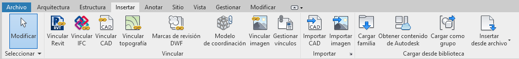La cinta de opciones aparece al crear o abrir un archivo. Proporciona todas las herramientas necesarias para crear un proyecto o una familia.