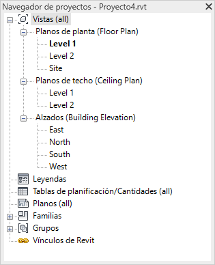 El Navegador de proyectos muestra una jerarquía lógica de todas las vistas, tablas de planificación, planos, grupos y otras partes del proyecto actual. Al expandir o contraer una rama, aparecen o se ocultan los elementos de niveles inferiores.