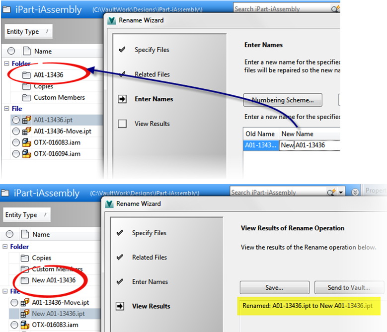 Si la subcarpeta de piezas miembro no está definida con el nombre de archivo de familia, Vault permite cambiar el nombre de la subcarpeta. Sin embargo, una vez que la subcarpeta tiene el mismo nombre que el archivo de familia, no se puede cambiar el nombre de la subcarpeta de nuevo.