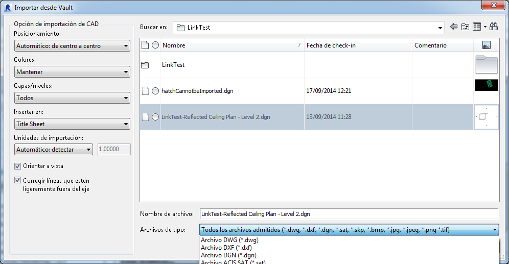 La opción Importar desde Vault permite importar archivos CAD o imágenes almacenados en un almacén en el proyecto de Revit actual.