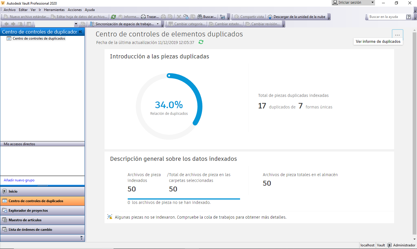 Utilice el centro de control para ver el estado de las piezas duplicadas e indexadas.