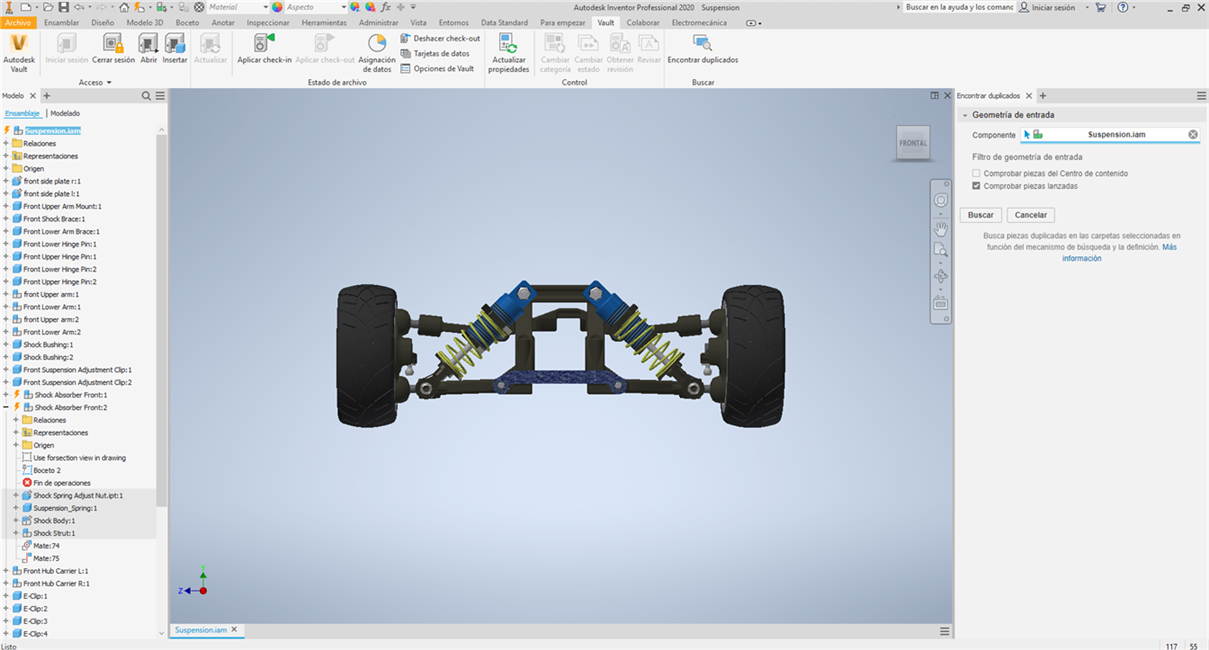 Los duplicados de los archivos de piezas dentro del ensamblaje se muestran en el panel Encontrar duplicados. Cuando se busca dentro de un ensamblaje, los grupos duplicados se muestran primero. Haga clic en el grupo para revisar los archivos de pieza duplicados desde Vault.