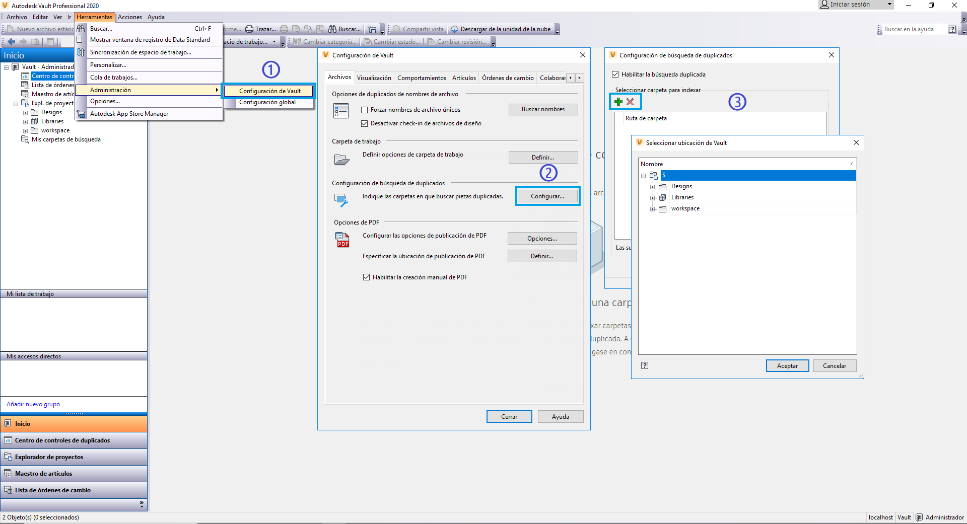 En el cuadro de diálogo Configuración de Vault, defina el rango de búsqueda. Especifique las carpetas donde se indexarán las piezas.
