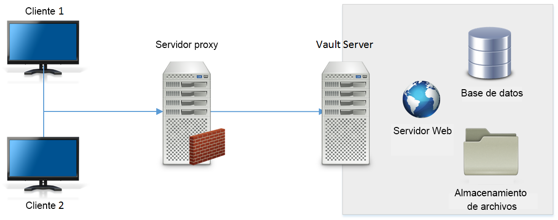 Hay tres componentes principales que conforman el servidor de Vault: un servidor web, una base de datos y un almacenamiento de archivos. En la siguiente figura se muestra la configuración básica de los componentes.