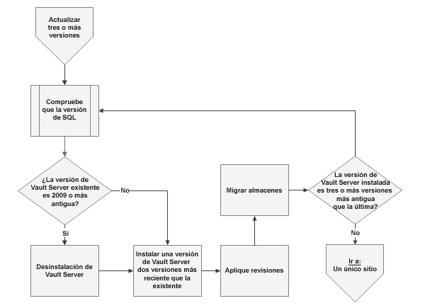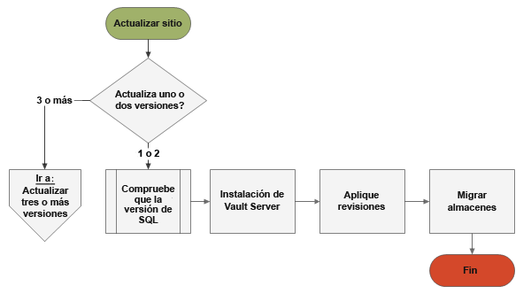 Actualización de una o dos versiones implica una instalación del servidor de Vault. Actualizar tres o más versiones requiere instalaciones intermedios del servidor de Vault.