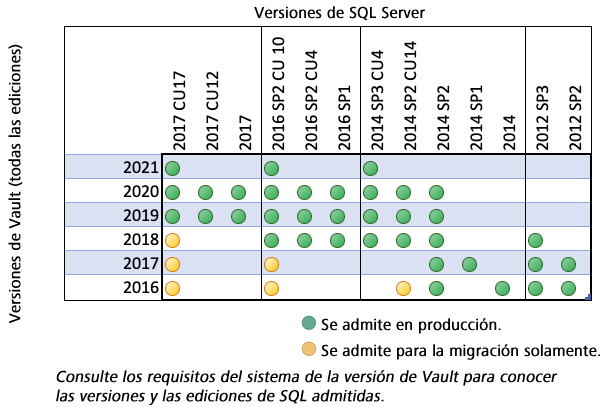 En la siguiente tabla se resumen las versiones compatibles de Vault y SQL con puntos de color verde. Los puntos de color amarillo son la ruta de actualización recomendada. Consulte Requisitos del sistema de Vault para su versión de Vault a fin de garantizar la compatibilidad entre versiones del producto Vault y SQL.