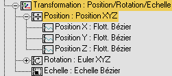 Le contrôleur Position XYZ fractionne les composantes X, Y et Z en trois pistes distinctes de la même manière que le contrôleur de rotation Euler XYZ). Les trois pistes peuvent ainsi être contrôlées individuellement lorsqu'elles sont référencées par les contrôleurs d'expressions.